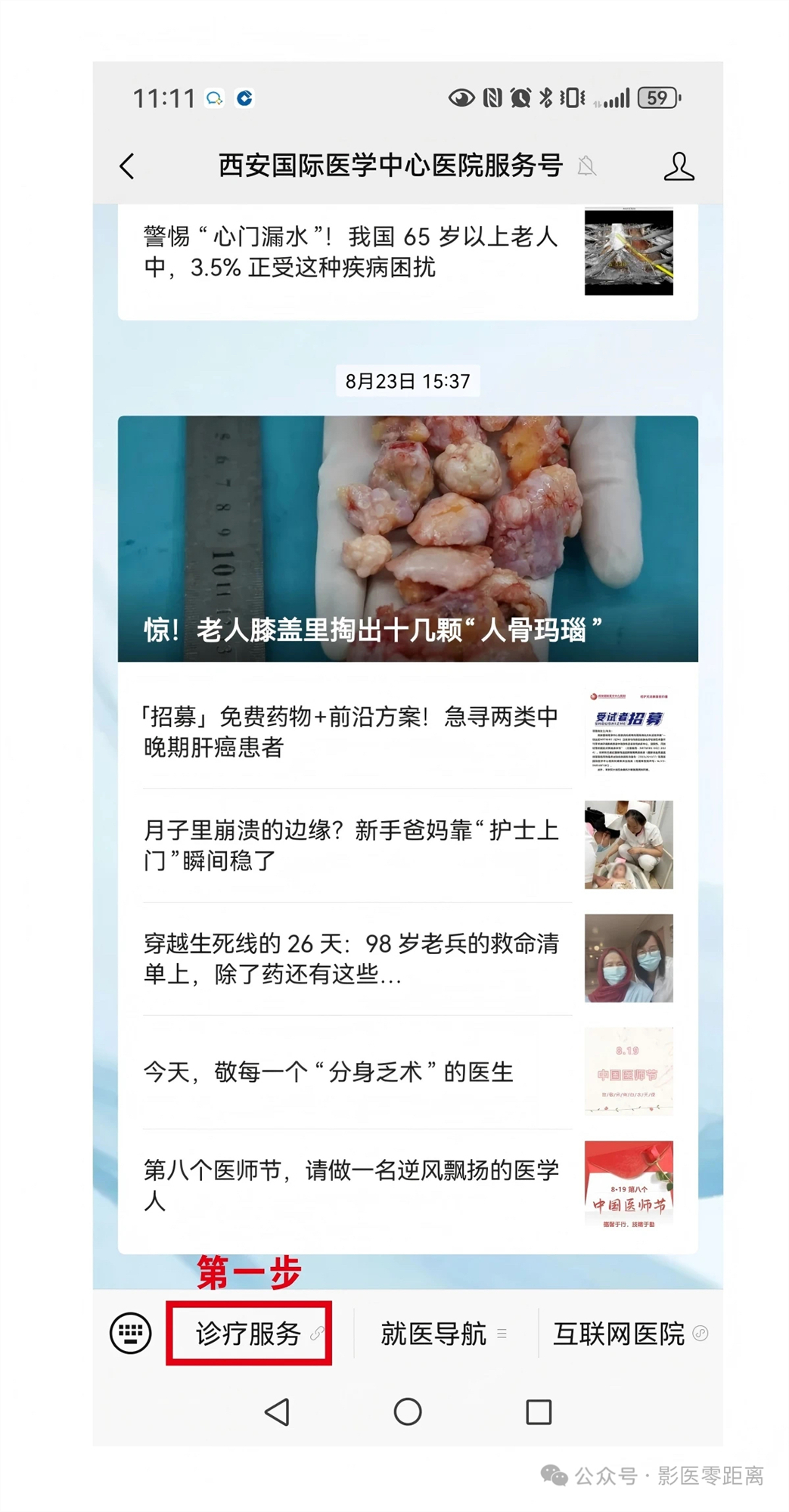 第一步:在醫(yī)院微信公眾號首頁,點(diǎn)擊底部菜單欄左側(cè)的【診療服務(wù)】入口